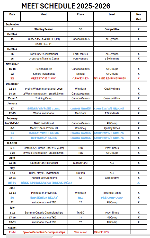 Joining the Next Generation Training Group offers swimmers the opportunity to excel at a young age, develop strong foundational skills, and learn the importance of commitment and dedication to the sport. Swimmers in this program will benefit from quality coaching, a supportive team environment, and exposure to high-level meets in Canada.