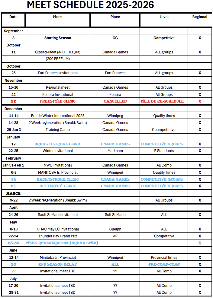 - Transition to High Performance Group: Swimmers achieving a Provincial standard may attend one meet. Continued participation requires moving to the High Performance Training Group.